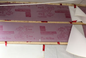 Polystyrene board 25 mm (1 in.) was glued to the polyethylene to provide a smooth surface on which to mount the VIPs. Studs 50 x 75 mm (2x3 in.) were mounted on the polystyrene board and attached to the concrete wall with anchors. A jig was used to ensure accurate placement of the studs so that the VIPs would fit snugly between them. The VIPs, temporarily held in place with a peel-and-stick membrane, were mounted between the studs. The VIPs were covered with 6 mm (1/4 in.) foam material held in place temporarily with sheathing tape. This meant that no adhesive was in contact with the aluminum film cover of the VIPs, reducing the potential for mechanical rubbing on the VIP surface.