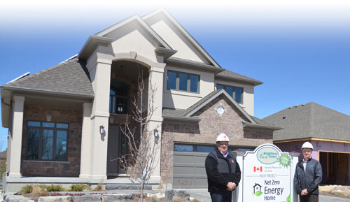 Andy Goyda (L), Canadian Builder Lead for Owens Corning Canada, together with Steven Wright (R), President of Wrighthaven Homes Limited, stand in front of Wright's first Net Zero Energy (NZE) home, which used the Owens Corning CodeBord Air Barrier System.