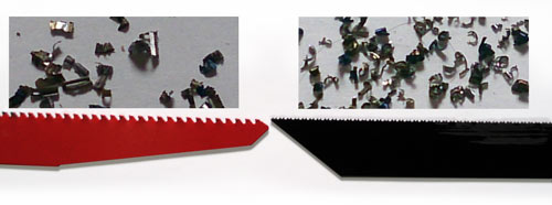 Large teeth from Diablo recip blade (L) shave through both metal and wood.