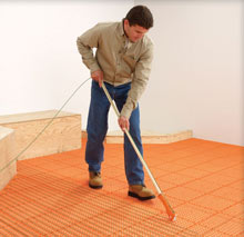 FlexTherm got more active in its wire attachment systems, bringing out its very unique FlexSnap. This is an open plastic grid, made of 1'x1' interlocking squares. It is screwed down to the floor on the 1x1 corners and then the cable is incredibly quickly "snapped" into place with a rolling insert head on the end of a broomstick. The grid pattern ended up giving enough rigidity to the floor to eliminate that extra plywood layer in most circumstances, just like the Schluter DITRA membrane. It does not provide uncoupling or waterproofing, but it does make custom layouts of electrically heated floors even easier to install.