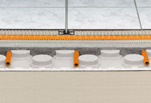 Most of Europe provides radiant heat with hydronic tubes, as does most of Canada. So Schluter North America decided to import BEKOTEC, its studded polystyrene screed panels for easy layout of heating tubbing and stress removal, still covering the assembly with the DITRA. This was a breakthrough for large commercial and industrial heated floors. It was now possible to bypass the tedious tying of tubing to rebar, plus the heat source was located directly under the tiles rather than buried in the concrete slab giving far faster response times.