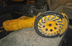 There has been quite a development of shrouds added right onto the tool itself, with a long hose off to the vacuum. The concrete or stone surface grinder is one of the worst silica dust makers. If you do not have a vacuum shroud for this tool, run to the store to find one. Some are brand specific, some are universal but most tool manufactures now make them.