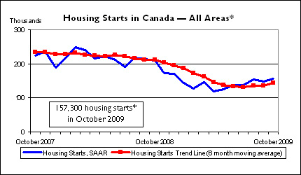 OTTAWA – The seasonally adjusted annual rate of new home construction was up in October. According to the Canada Mortgage and Housing Corporation, starts rose from 149,300 units to 157,300 units in October – a 5.4 per cent increase.