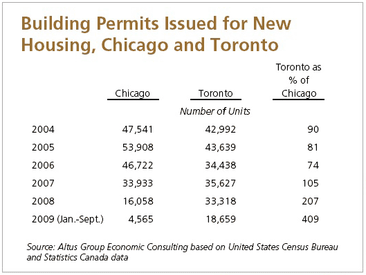 Also in the November edition of the Altus Group Housing Report, the housing market performances of Chicago and Toronto were compared. The report finds that Toronto outperformed the Windy City in a number of key areas such as overall economy, current housing market conditions, overall labour attractiveness and recent population growth.