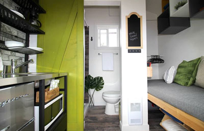 Despite its compact space, the Yocto comes with full-sized appliances, a closet and a built-in bed and mattress.