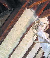 Polyurethane really begins to justify its cost when sprayed-on polyurethane is used for insulation, air sealing and vapour retardation all in one shot, or simply fitting into irregular spaces. Some will use this for a whole wall, others will use it locally; such as in the header space or over the double header of outer walls to get maximum insulation while leaving an air passage during re-roofing jobs. Cellulous wet spray and the light weight concrete Air Krete are two air tight spray-in-place products that have the extra property that they will not burn or smoke.