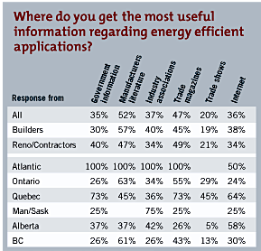 In Quebec, government information and trade magazines were chosen by 73 per cent of respondents, followed by the Internet at 64 per cent. The Internet was also a strong source of information for B.C. respondents (30 per cent), but stronger in Alberta, where it was listed as the first source for information at 58 per cent.