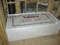 TubSkin(tm) adheres to tub surfaces - without transferring its adhesive - protecting them from damage during construction. Not to be confused with another company's purple paint on/peel off product, this is a thick layer of puncture- and water-resistant polyethylene foam that can also act as padding for plywood if the tub needs to be used as a standing platform.