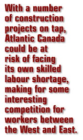 In a region where the natural birth rate is negative, any good news for Atlantic Canada's economy is welcome. Though Western Canada continues to post the strongest growth in the country, a BMO Capital Market Economics report points out that one trend seeing a reversal is the flow of migrants. "Net interprovincial migration to Alberta hit a record 58,200 people in 2006, with many leaving Atlantic Canada in search of high-paying jobs," the report states. "However, late-2007 saw a sharp reversal in this pattern, with Alberta recording its biggest quarterly outflow since 1988 and Atlantic Canada experiencing in-migration and accelerating population growth. With a number of construction projects on tap, Atlantic Canada could be at risk of facing its own skilled labour shortage, making for some interesting competition for workers between the West and East."