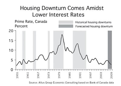 The forecast for housing construction activity in Canada for 2009 and beyond is being influenced by a number of emerging and fluid issues. Canada’s mortgage lenders are still eager to court the business of potential home buyers, and they are starting to pass through declines in interest rates to borrowers. The Bank of Canada has recently lowered its key lending rate to historic lows, and has taken the nearly-unprecedented action of making a “conditional commitment” not to raise this rate at least until mid-year 2010. The lower and more stable rates during this housing downturn are in sharp contrast to any since the 1950s (see illustration). Low rates should help restart the home buying engine, as will improvements to affordability through more stable prices and potential savings passed on to home buyers by lower construction costs.