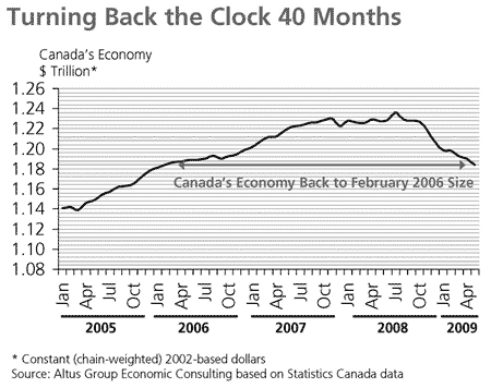The greatest challenge an economy faces following a recession is how to cope with excess capacity. Generally we concentrate on citing the marginal percentage changes from month to month, or quarter to quarter, in economic growth, but it is also telling to focus on the actual size of the economy. In May, Statistics Canada reported that the total size of the economy (as reported in constant 2002 based dollars) was $1.184 trillion. This is down almost $52 billion from a peak in July 2008 and brings the economy back to its size (in inflation adjusted terms) of February 2006.