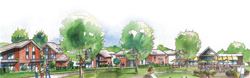 Displace streets with paths wherever possible. Only cars need 60-foot wide asphalted streets; people will enjoy a 15-foot, exclusive path. No resident takes pride or pays a premium for living on a wide, asphalted road.