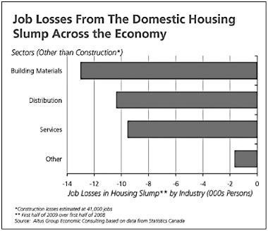 Through the recession, jobs directly related to residential construction declined by an estimated 41,000 persons in Canada, while related jobs in manufacturing, distribution, services and other sectors fell by an additional 35,000 persons. Among these spin-off jobs, the building materials manufacturing sector has lost of almost 13,000 jobs, in addition to 10,400 jobs related to the distribution of building products (the wholesale, retail and transportation sectors) and 9,500 job in various companies providing services to the residential construction sector.