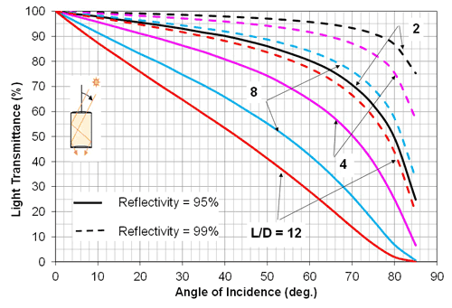Figure 3 illustrates how the amount of sunlight is transmitted through a straight pipe (without the roof collector, ceiling diffuser and any elbow) as influenced by the pipe aspect ratio, reflectivity of the interior pipe surface, and the angle at which sunlight strikes the pipe opening surface (the angle of incidence).