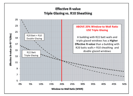 Above 13% WWR, a high-performance triple-glazed window had a greater positive impact on the effective R-value of a wall assembly with R22 batts than simply adding R5 insulated sheathing.
