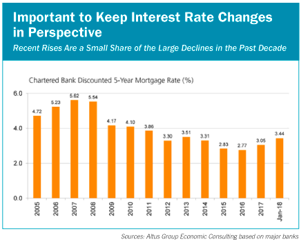 2017 was the year that mortgage interest rates began to retrace some of their long-term trend declines. Many in the industry are concerned that this will pose some sort of risk on the horizon, but the impact that interest rates will have on the 2018 market is likely to be pretty muted. First, while the effective five-year mortgage rate rose about 45 basis points through 2017 and may see some further modest rise in 2018, these changes are still pretty minor in comparison with the almost 300-basis-point decline over the past decade.