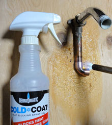 From Bernzomatic comes a great thermal shield gel they call Cold Coat (found on Amazon.ca) or Worthington Cold Coat Gel Spray (found at Canadian Tire online). This is a spray gel that can protect wood from the plumbing torch, or prevent heat from moving down the copper pipe—and that protects rubber washers that are close to your soldering job, or even blocks the loss of heat to water in the pipe a foot away. In this photo you can see the gel on the plywood with absolutely no burn marks from the flame that is only an inch away. You can leave the gel to eventually evaporate. Products like this help us to solder quickly and safely with good results—keeping the heat where we need it.