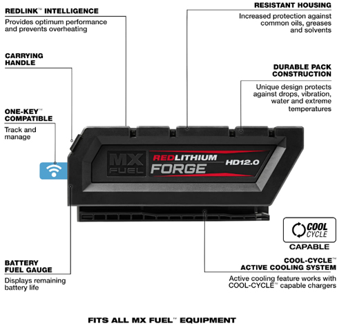 Compared to the previous MX FUEL model, Milwaukee's MX FUEL REDLITHIUM FORGE HD12.0 battery pack provides twice as much runtime. And when used with the MX FUEL Super Charger, it charges fully in just 65 minutes.